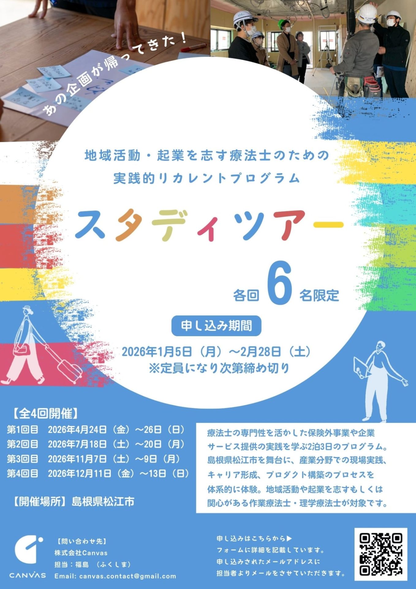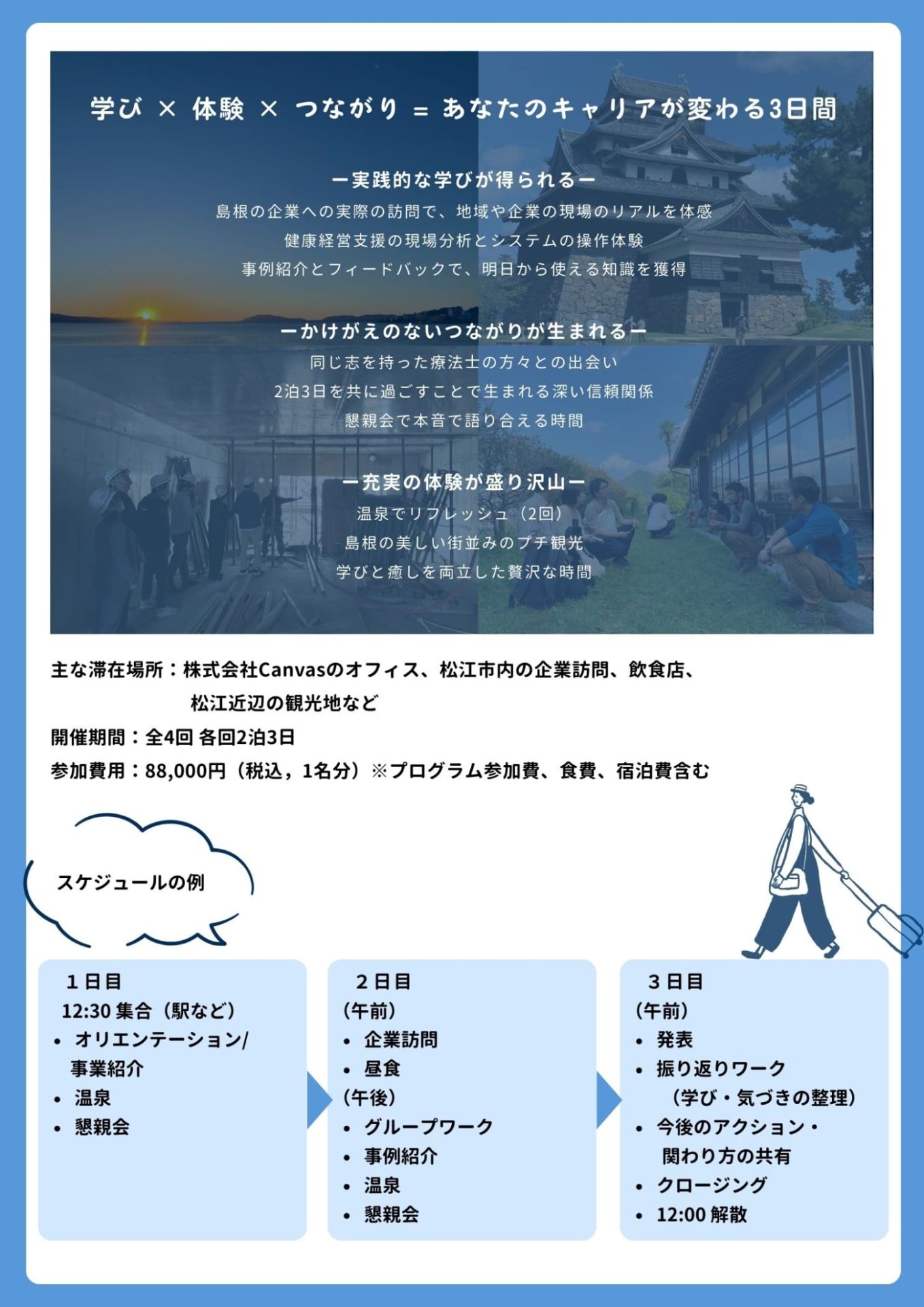 これまで、株式会社Canvasでは「スタディツアー」と題して創業2年目から地域課題解決を行う療法士向けの2泊3日リカレント(学び直し)ツアーを島根県松江市で開催してきました(およそ30回開催、のべ参加人数日本中から150名以上!)。